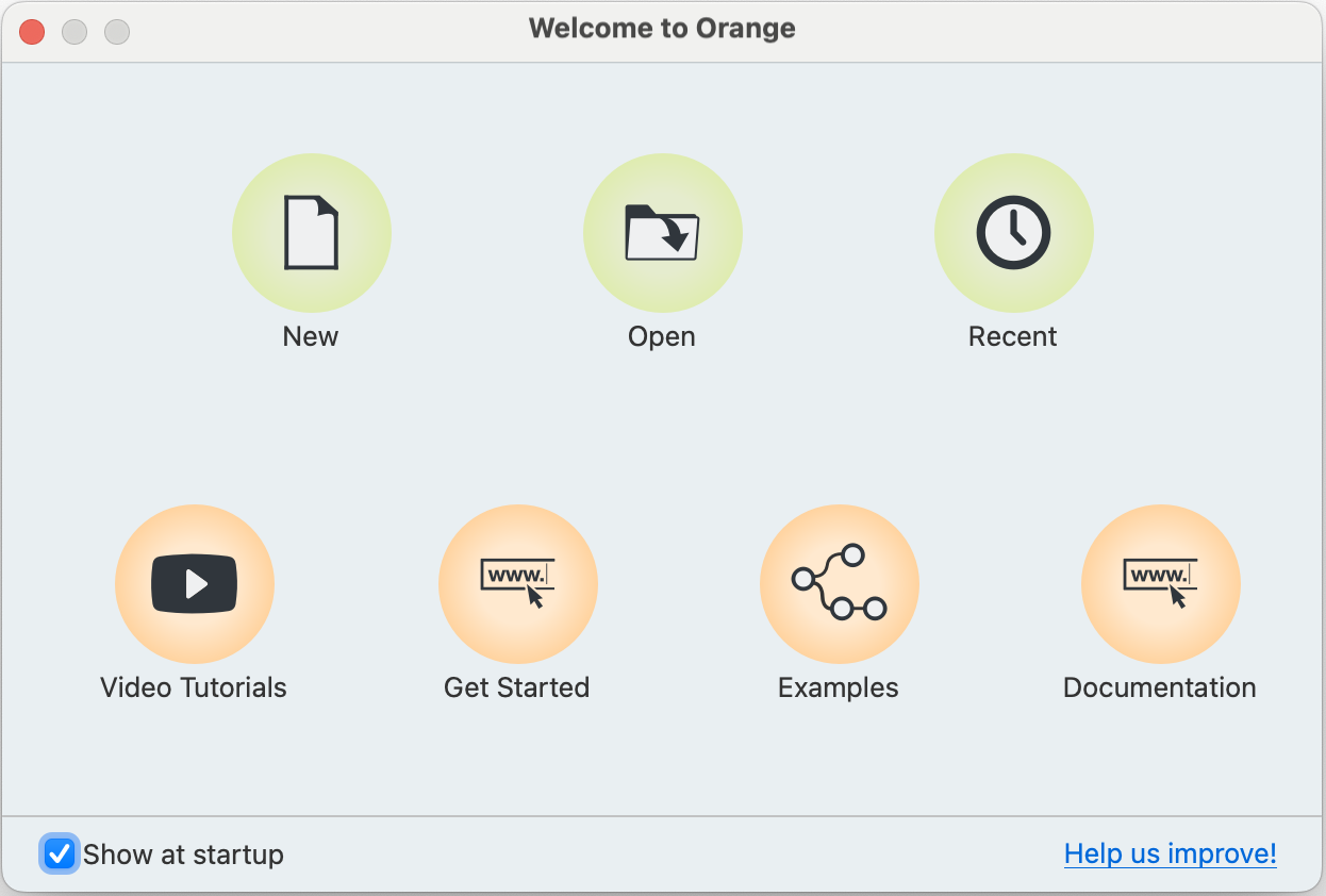 Khi bạn khởi chạy Orange lần đầu (hoặc khi bạn muốn tạo một project mới bằng cách chọn File -> New), bạn sẽ thấy màn hình Chào mừng (Welcome Screen).
