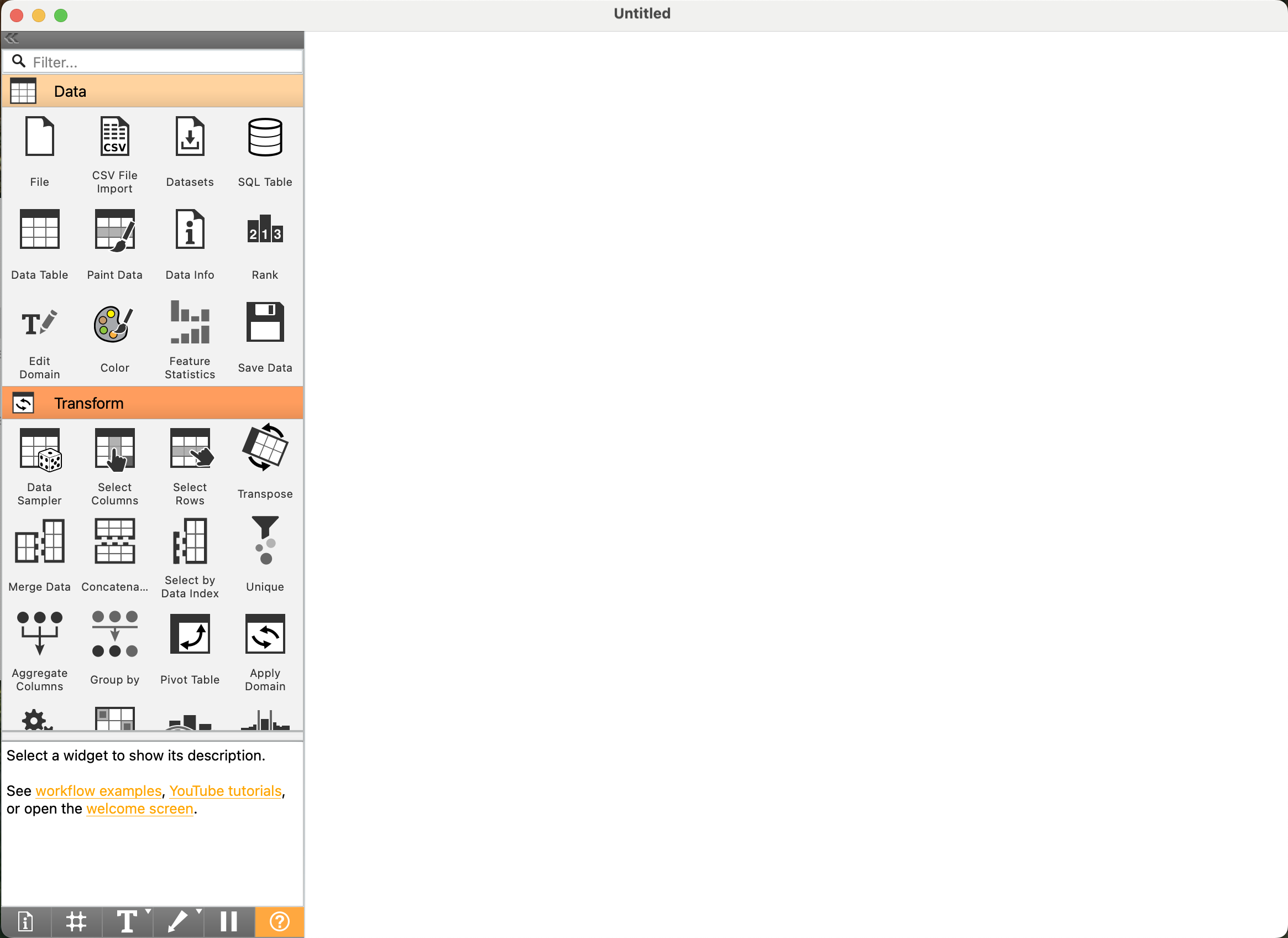 Sau khi tạo một workflow mới, bạn sẽ thấy giao diện chính của Orange, bao gồm hai khu vực quan trọng: