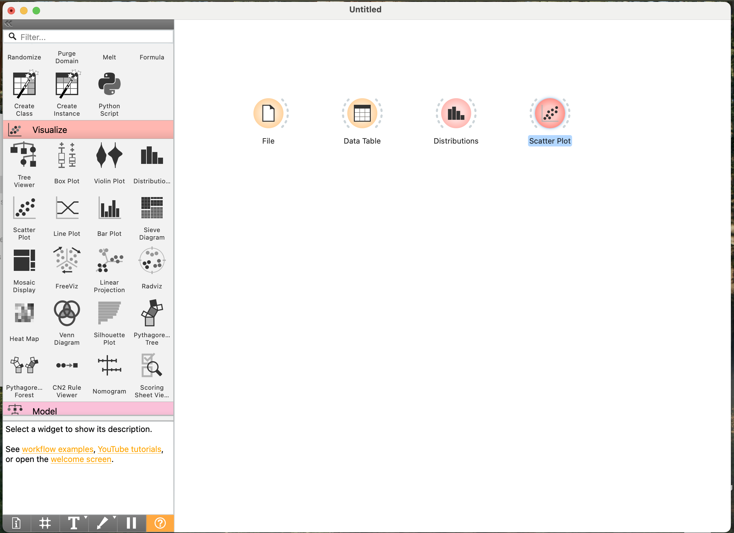 File,Data Table,Select Columns). - Visualize: Các widget để tạo biểu đồ và trực quan hóa dữ liệu (ví dụ: